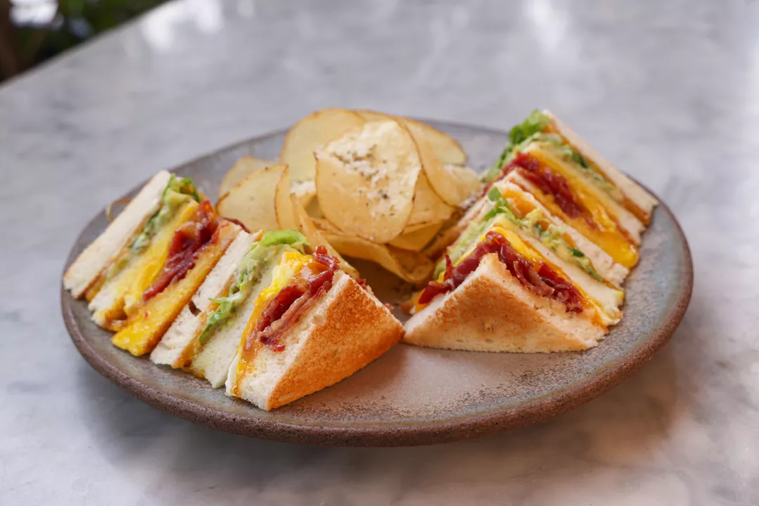 ساندويتش كلوب بيكون مع طبقة من شراب المابل، جبن شيدر، أفوكادو، خس روماني، مايونيز، شبس، جبن بارميزان، أوريجانو مجفف